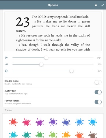 • READER MODE removes verse numbers for increased clarity and focus