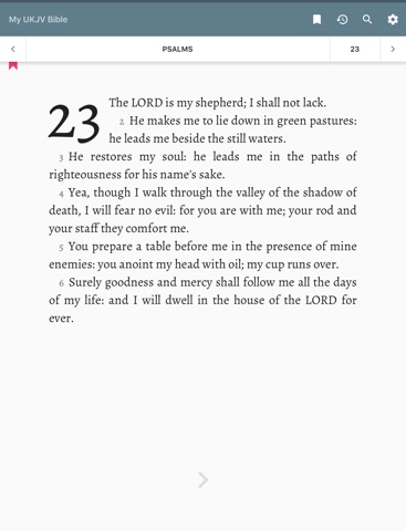 My UKJV Bible is a stunning app for reading the Updated King James Version of Gods Word. Designed with the devote reader in mind, it comes with Smart Bookmarks that follow you and a unique Reader Mode that removes verse numbers for optimum focus. Well-tuned typography eases your eyes. Elegant design makes the app a joy to use. And powerful customization makes it YOUR Bible!