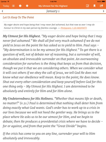 Great devotional, not a great app, especially for $5.00. I expect their will be updates, as I experience frequent crashes, and the design isnt too attractive. Still, it gets the simple job done of reading daily devos, and allows you to take notes. I was surprised to see you cant highlight. That should be added to make this app at least be as useful as a hard copy version of My Utmost for His Highest.