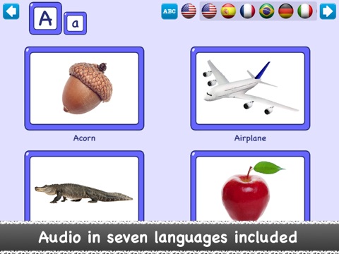 * Letters, words and audio are in 7 languages: English, French, Spanish, Portuguese, German, Italian and Mandarin Chinese.