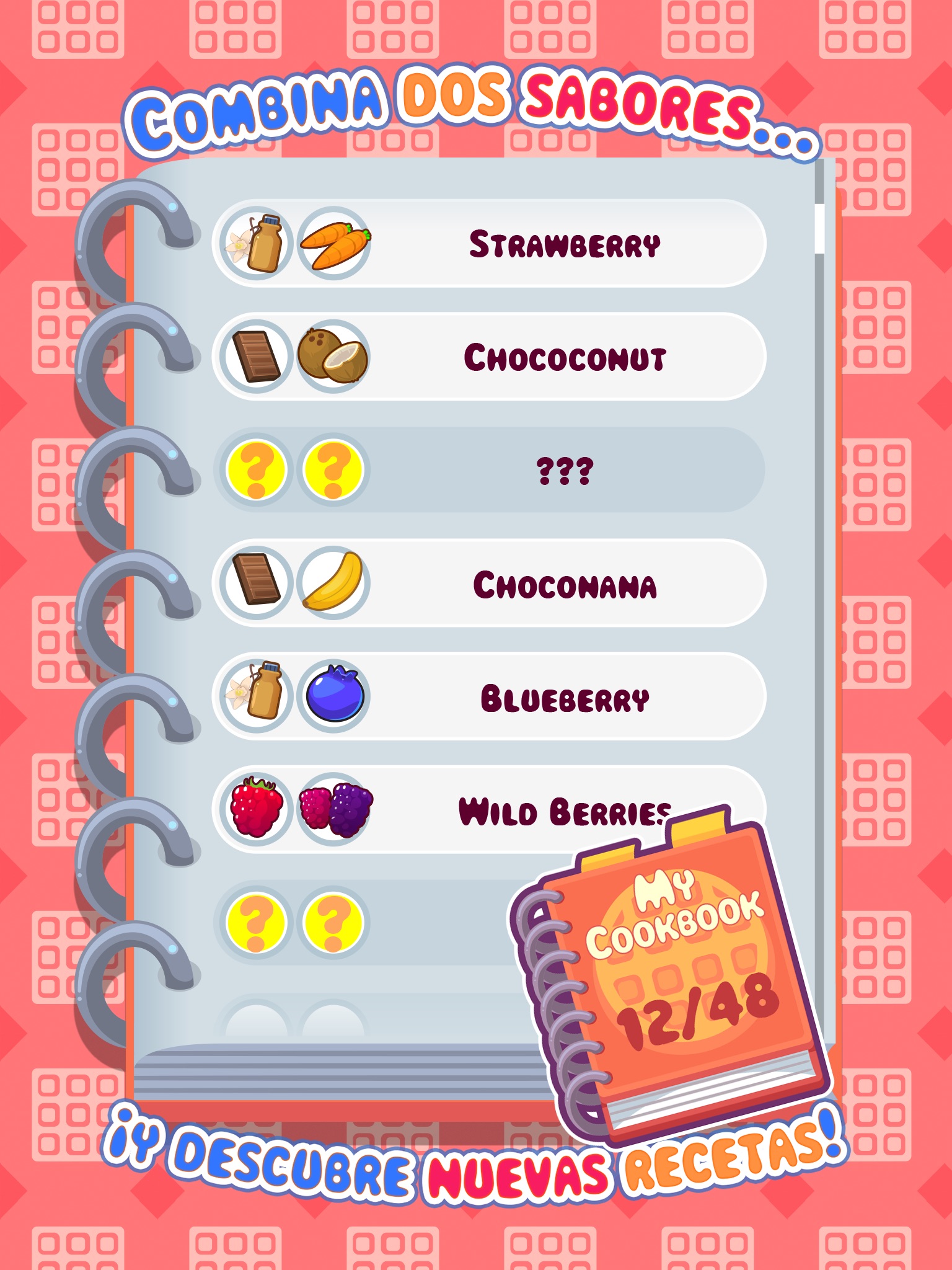Mix flavors and create unique waffles! Go CHOCONANAS mixing and matching! Combine two flavors and discover new recipes to add to your recipe book – you have to keep guessing and trying out new things so you can get them right and complete your book of delights!