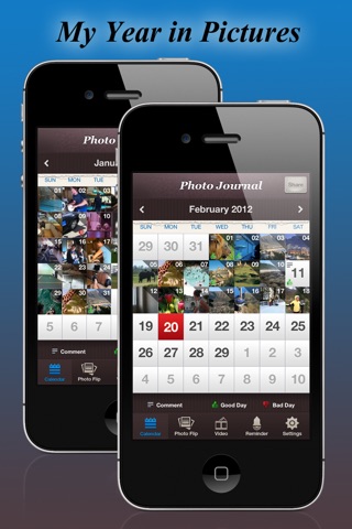 This app does it all. A beautifully designed calendar view lets you see a thumbnail of all the pictures you have taken for that month. Quickly scan the monthly view to look for particularly good days or bad days. Record a comment to further explain what happened on a particular day.