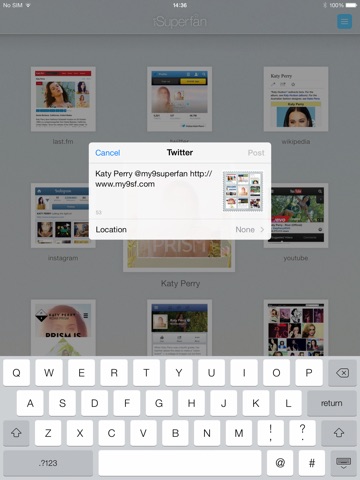 my9 superfan (my9sf) is the social music powerhouse, combining live feeds from twitter, facebook, youtube, instagram, flickr, wikipedia & last.fm, plus the artists own website - together on one screen, in a fast, effortless & unique way - Its the ultimate in-App fan browsing experience.