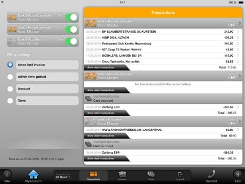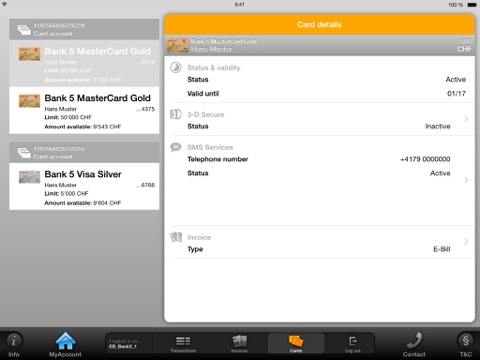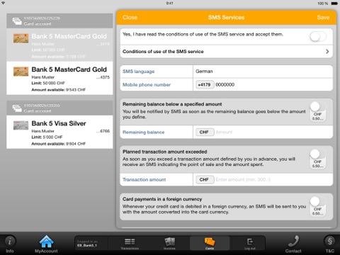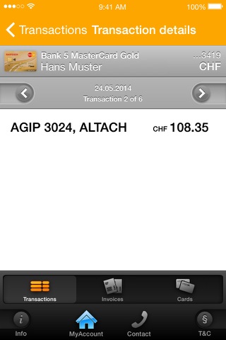 To use the App and its free services (online services) of Viseca Card Services SA you must have a credit card and / or PrePaid of Viseca Card Services SA and have registered via the Internet (www.viseca.ch ) to the online services (MyAccount) of Viseca Card Services SA. With the installation of MyAccount Mobile App you must accept the “Special Conditions” for the use of Viseca Card Services SA‘s MyAccount Mobile App.