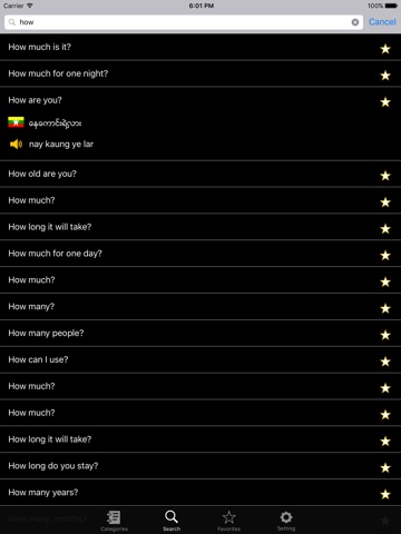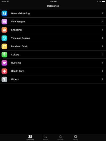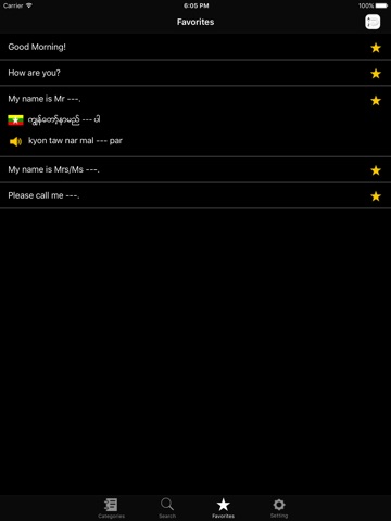 This app is a guide for travelling in Myanmar Language. This is intended for foreigners who are in Myanmar and to make good communication with Myanmar people. Now there are about 1500 daily usages in English to Myanmar, Myanmar to English. In this app, Myanmar pronunciations are also written in English to be easily pronounced Myanmar words. Furthermore user can easily change setting for a language switch – English to Myanmar, Myanmar to English. Searching is also added here in order to search desired keywords in a short time.