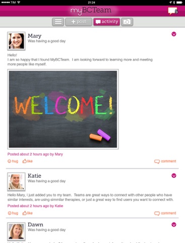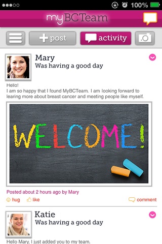 MyBCTeam is a social network and support group for women facing breast cancer. Get the emotional support you need from others like you, get practical tips to manage your life with breast cancer, and insights about treatment or therapies. MyBCTeam is the only social network where you can truly connect, make real friendships, and share daily ups and downs in a judgment-free place.
