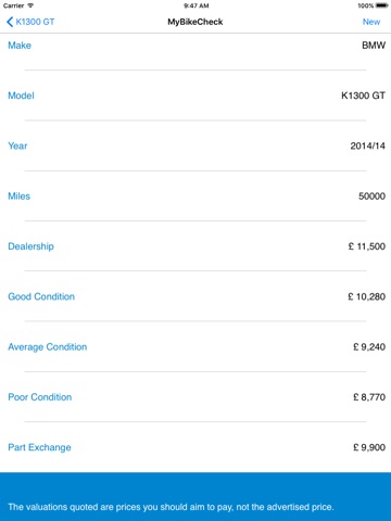 Get the value of a Motorbike instantly, whether your buying a used bike of selling one, this is a great app you can take with you. All prices all updated regularly based on market conditions, standard bike depreciation by bike model and motorcycle manufacturer and UK resale price of over thousands of bikes.