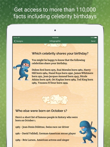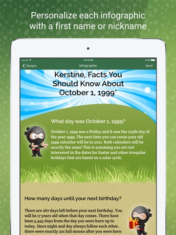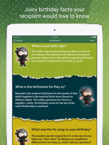 This app will present all the info tidbits into a captivating infographic. Our ninja will make sure to grab the attention of your recipient. Be the first among your friends to send this unique happy birthday card. Don’t be surprised if your recipient never forgets you.