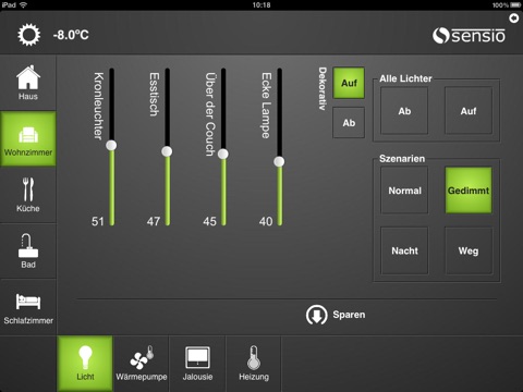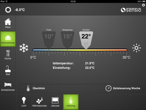 Jeder Raum verfügt über individuelle Zeitschaltuhren für Licht und Heizung. Jede Szene kann individuell auf eine Zeit gelegt werden.