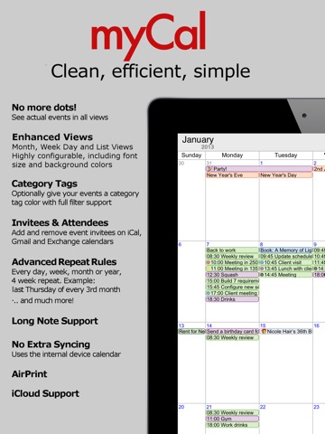 • Sync with iCloud, Google, Yahoo, Exchange and other cloud based calendars