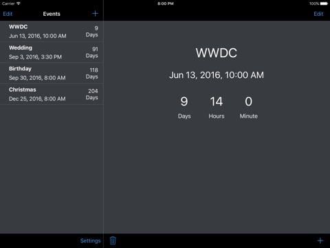 MyCntdwn (short for My Countdown) is a simple application that allows you to set events in the future and then have an easy way to see how long is left before the event gets here. You can use it for events like vacations, weddings, holidays, etc.