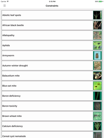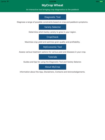 The Diagnostic Tool quickly diagnoses a range of possible constraints based on real-time crop and paddock symptoms. It contains an extensive image and factsheet library for 90 in-crop wheat constraints - helping you to accurately identify constraints and determine possible management solutions. Covering a broad range of diseases, pests, nutrient deficiencies, herbicide damage symptoms and other management and environmental production issues it is bound to be a helpful tool in the paddock.