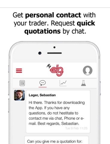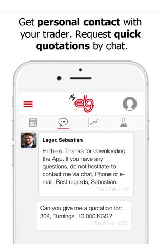 Communicate in real-time with your designated trader through chat. The ability to ask for quick quotations. Send pictures of materials.