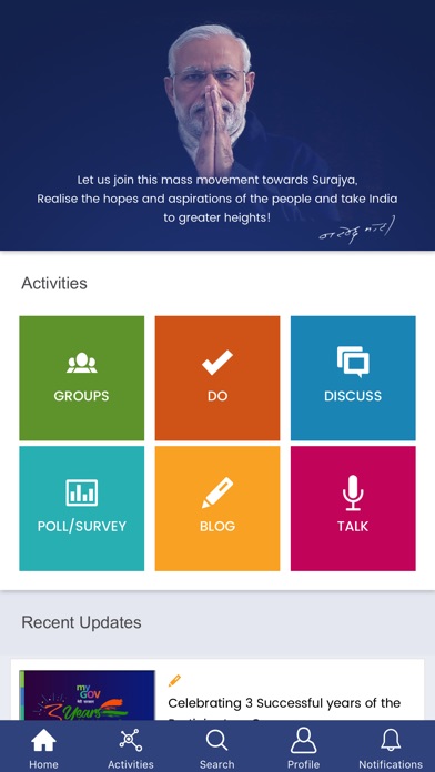 MyGov is Government of India’s innovative citizen engagement platform for direct citizen participation in governance by providing an avenue for channelizing their ideas, comments and creative suggestions to Central Ministries and associated organizations. Citizens can participate in policy formulation and program implementation to usher in an era of direct participatory democracy.