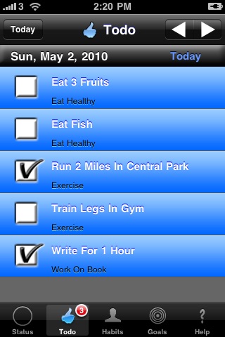 MyHabit helps you manage your habit change efforts. MyHabits helps you plan your habit changes by letting you set up goals, habits and mini plans. MyHabits helps you execute your habit change plans by converting your mini plans into daily todos. MyHabit helps you do a quick self-assessment via a Willpower Barometer. The Willpower Barometer shows you how consistent you have been the last seven days in executing on your daily todos.