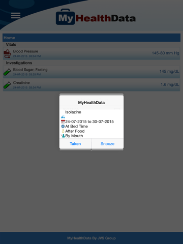 Forgetting to take medicines on time has become a common issue. MyHealthData app has it’s own “time for medicine” reminder feature, which promptly lets users to take medicine on time. Moreover, in the event users were not able to consume medicine, alerts are to the physician and family as well.