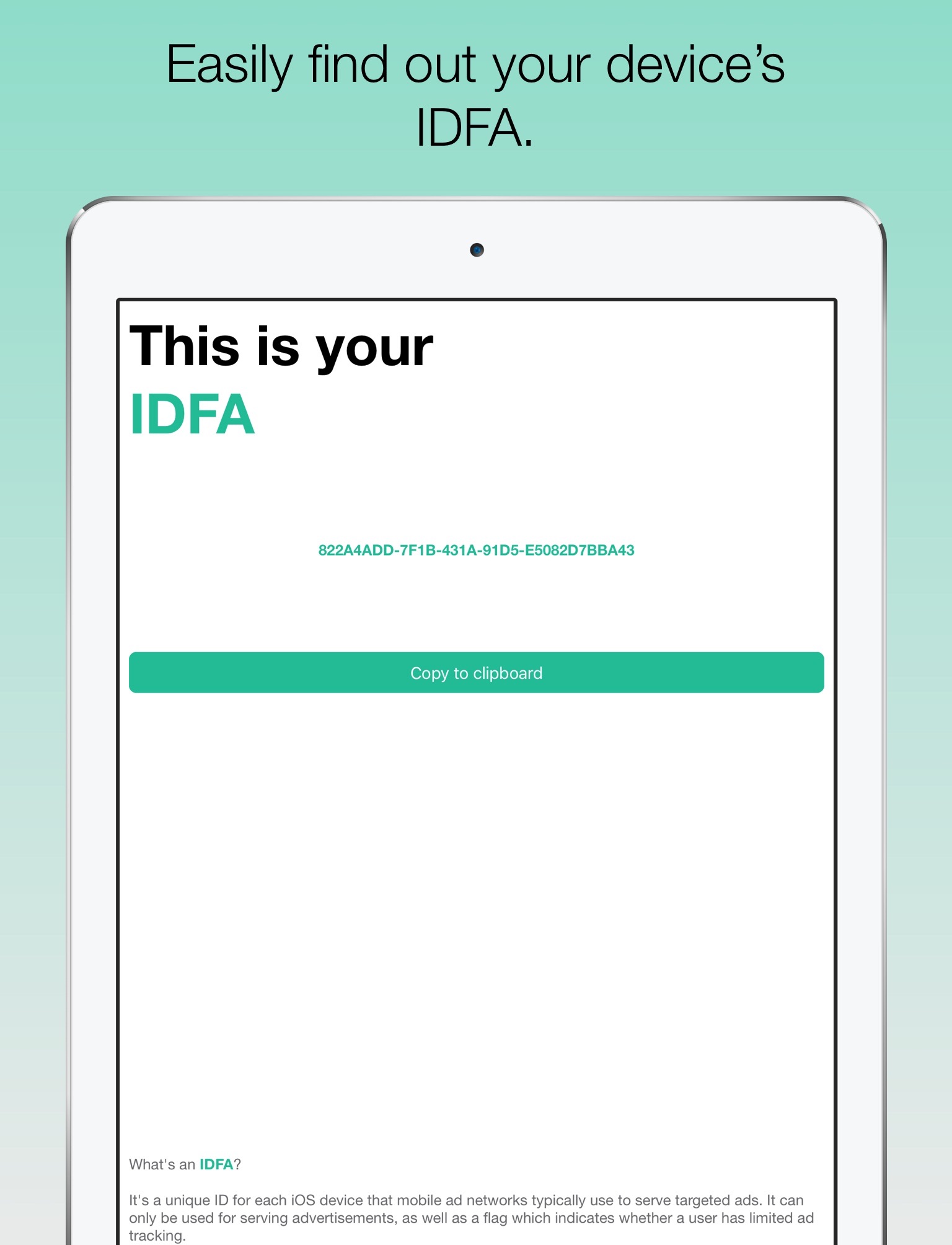 Having trouble debugging tracking links and marketing campaigns? Find your devices IDFA quickly with this super light weight app.