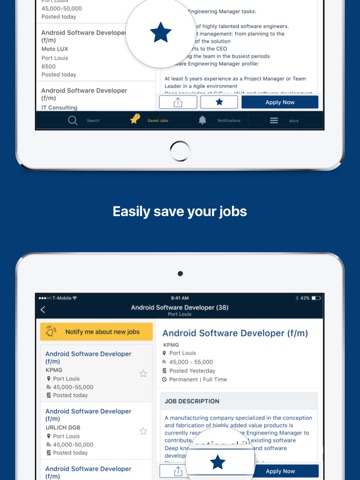 Find your new job in Mauritius. The MyJob.mu job app will take your job search to a new level. Take the next step in your career and search jobs in 30+ industry sectors across Mauritius. Find and apply for the latest jobs from big name companies to local businesses. Refine jobs by location; filter jobs by relevance and date, find full-time, part-time, permanent, temporary and contract jobs. Create job alerts and get push notifications on the latest jobs. Save the jobs you want. Need to apply later? Then email job details to yourself.