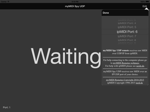 myMIDI Spy receives raw MIDI through ipMIDI. For help connecting to the computer please see www.mymidiremotes.com. myMIDI Spy displays raw MIDI messages that are being sent through the ipMIDI port that you selected.