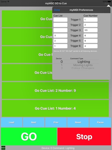 myMSC GO to Cue sends MIDI Show Control commands (GO, Stop, Next, Prev., Pause, and Reset) to the selected device number. Plus 6 GO cue triggers, that you set the cue list and cue number for each trigger on the Preference page. Cue list is not require.