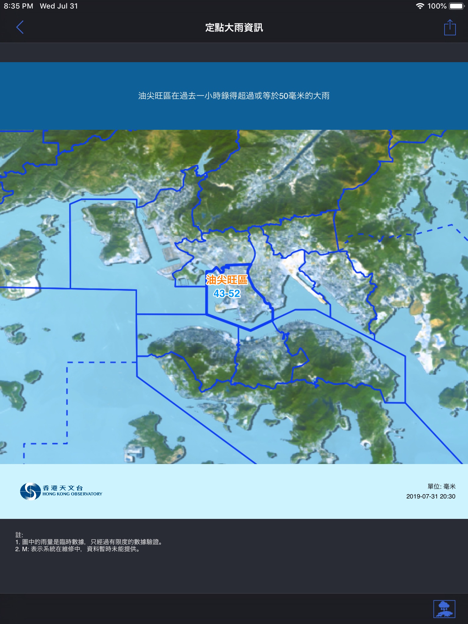 1. The notification service of weather warnings, Special Weather Tips, and Location-based Rain Forecast is provided through the Apple Push Notification service (APNs). The Hong Kong Observatory cannot guarantee the reception of the above notifications by users. Users should not rely on the mobile app as the only means for reception of important weather information. Depending on factors such as network usage and quality of users mobile phone connection, it may take 5 to 20 minutes or even longer for the app to receive the notification after it is issued by the Hong Kong Observatory.
