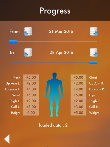 The fifth function allows the visualization of the improvements based on the selected period: selecting a date interval you will be able to see changes in your body.