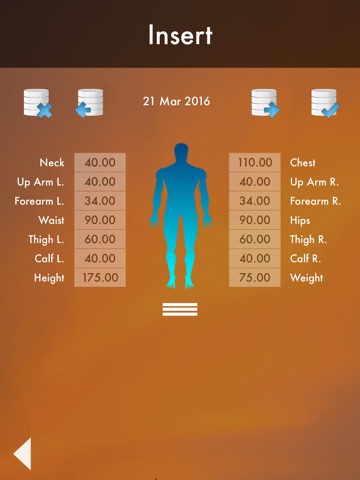 The third function allows you to insert all the body measurements ( weight, height, muscle circumference , waist, etc. ) on a specific date