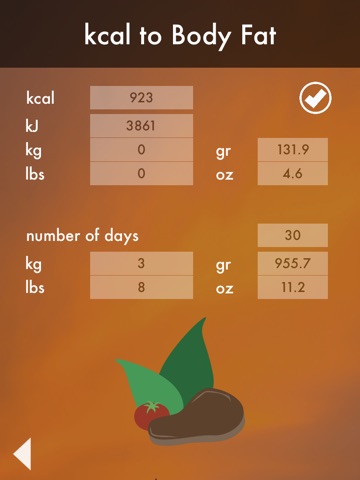 With the first function ( kcal to body fat converter ) you can determine the amount of body fat that corresponds to a food. By entering kcal well get the corresponding weight . By entering the number of days well get the amount of fat corresponding to those days.