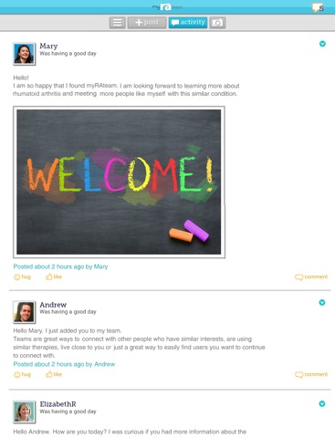 myRAteam is a social network and support group for those living with rheumatoid arthritis. Get the emotional support you need from others like you, get practical tips to manage your life with RA, and insights about treatment or therapies. myRAteam is the only social network where you can truly connect, make real friendships, and share daily ups and downs in a judgment-free place.