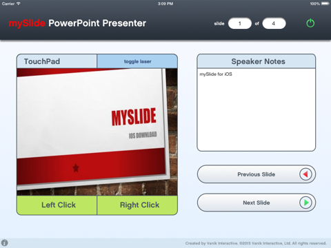 * Requires the free mySlide Server to be running on the host PC which can be download at http://www.vanikinteractive.com/apps/powerpoint/slideserver