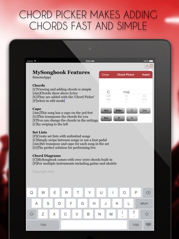 I have tried a bunch of different apps but MySongbook is by far the most flexible and easy to use one. If highlighting of text phrases will be implemented in some future updates Id appreciate it. Thanks.