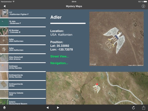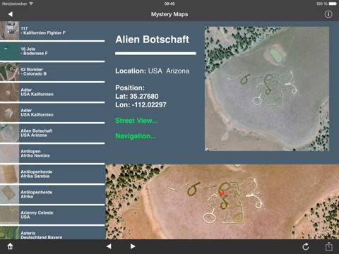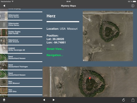 Mystery Maps shows extraordinary, strange, rare, strange map sections of our earth. The diversity of crop circles go on letters up UFO objects. All data incl. GPS coordinates have been compiled into a database and optically adjusted. You can view the object in a map, look around there by Street View or navigate to them.