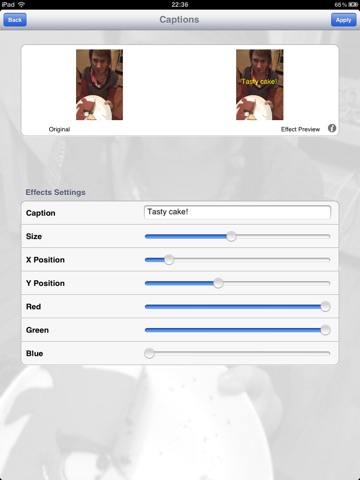 - visual effects including text captions, wipes, crossfades, black & white, sepia, color tinting and more