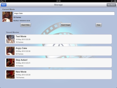 Your movies are made up of a series of photos - take each photo in turn, with a semi-transparent overlay (onion skin) of the previous frame to guide you. Alternatively, use the time lapse mode to capture a changing scene over time, or choose photos from your library.