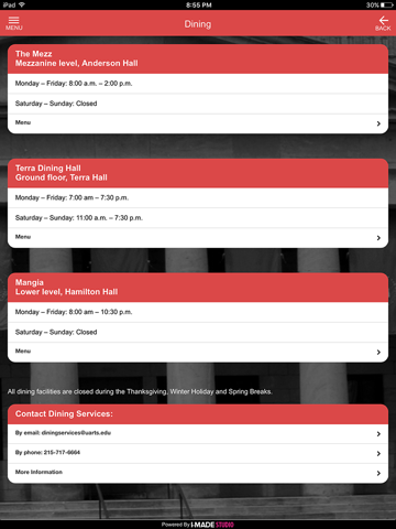 Dining: Access to UArts dining hall hours and menus.