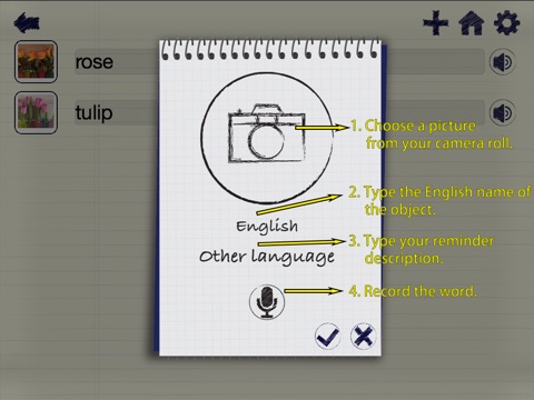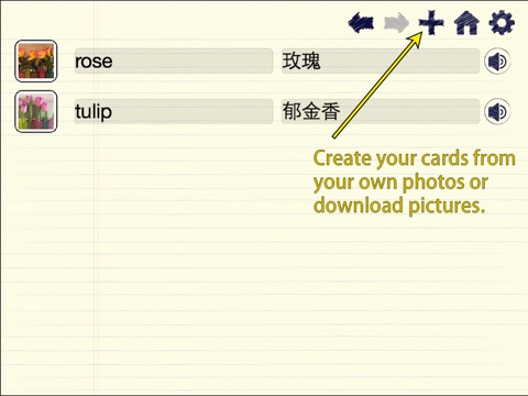 myVocab Notebook comes with a few cards to get you started, and its easy to add more cards from your own photos or downloaded images - choose images and descriptions which jog your memory, for a personalised experience sure to improve your English vocabulary.