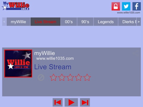 The myWillie103.5 player is Country…Your Way! It’s a revolutionary new way to listen to Willie 103.5. With multiple channels, you can listen to music that we are currently playing on the air, songs from Willies past, and even tune to Country Legends, Southern Rock, The Beach, Alt Country, 90’s or 00’s! You control what songs are played in each channel. Want to hear a favorite song more often? Rate it higher. Want to hear an over-played song less often? Rate it lower. Cant stand a song? Remove it! You can skip songs, replay songs from the beginning, and even jump to any place in a playing song.