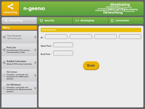 Port Scanner, Subnet Calculator, Bin to Dec converter, Dec to Bin converter, Hex to Dec converter, Dec to Hex converter, Octo to Dec converter, Dec to Octo converter, Password generator, whois... and much more