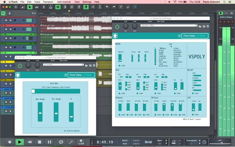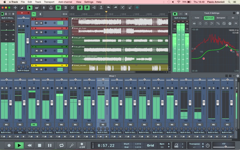 n-Track Studio is an digital audio workstation that turns your Mac into a full-fledged recording studio. You can record and playback a virtually unlimited number of audio and MIDI tracks. The program supports simultaneous recording from multiple 16 and 24 bit soundcards, and real-time audio effects can be applied non-destructively to each track. Built-in effects include Multiband Compression, Delay, Graphic EQ, Pitch Shift and time stretch, Parametric EQ, 3D spectrum analyzer with guitar tuner, Sonogram and much more.