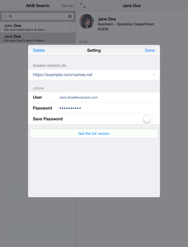 NAB Search Lite is the free version of NAB Search. It enables mobile access to the Domino Address Book to search for a contact person for evaluation purposes.