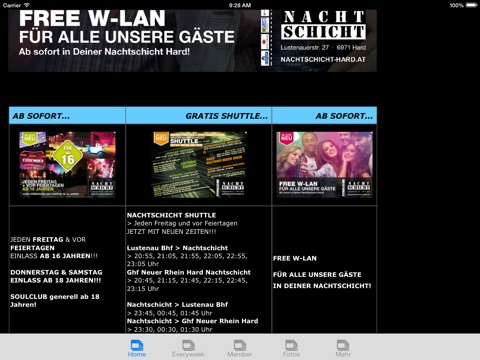 Das Nachtschicht-Wochenende wird schon Donnerstags eröffnet. Fox, Schlager und ein kostenloses Buffet erwarten die Besucher. Freitags wird wechselndes Show-Programm mit internationalen DJs und den trendigsten In-Labels präsentiert. Die bereits legendäre Mega-Party, mit Gästen aus Deutschland, der Schweiz und natürlich aus österreich, geht Samstags über die Bühne.