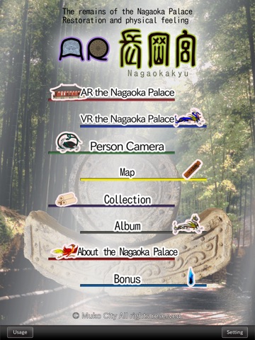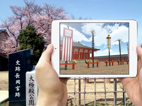 Historic sites of six areas of Kyoto Muko (Chodoin park, Daigokuden park, Dairi park, Imperial Palace inner bailey Mud-wall corridor(Former Ueda family residence), South Dairi park, The remains of mud wall) in, using the VR and AR this application, "Metropolitan Palace of ancient "the Nagaoka Palace"" it is an application that can experience but as if you were there in front of me.