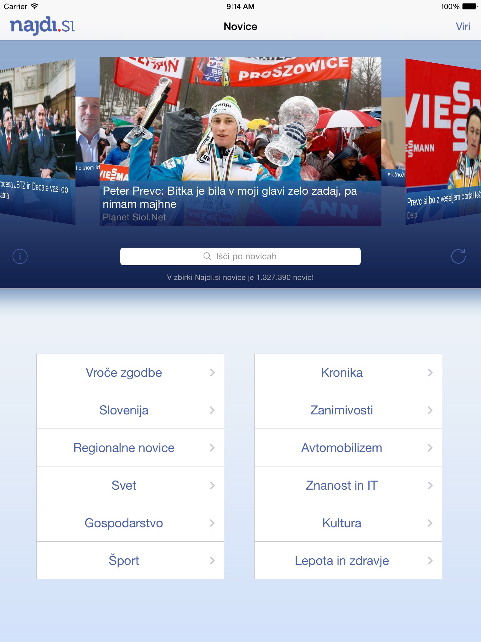 Aplikacija Najdi.si Novice ponuja celovit pregled novic iz več kot 100 različnih slovenskih medijev (Planet Siol.net, Dnevnik, Delo, Večer, Finance, RTV Slovenija, Računalniške novice, Monitor, Elle, Cosmopolitan, Mobinet in drugi priljubljeni viri novic).
