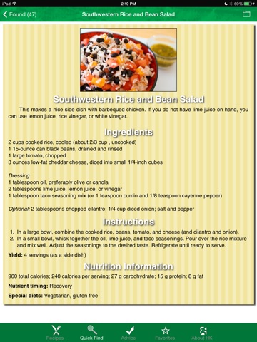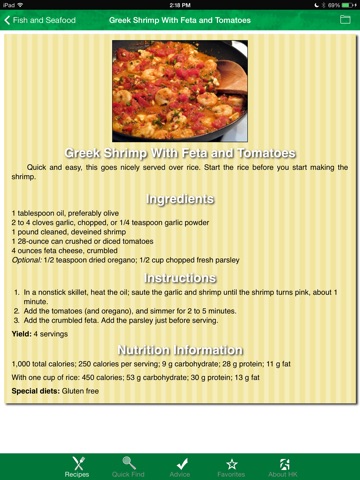This is an awesome app! The recipes are healthy and taste great but Im holding 1/2 STAR because Id love a Save to Favorites folder for my "Oven French Fries", "Mustard Dill Salmon" and "Fish in Foil Mexican Style"!