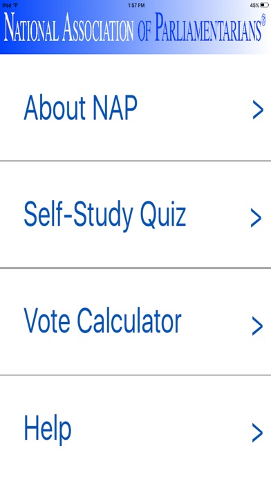 Become more knowledgable about parliamentary procedure and Robert’s Rules of Order with the official app of the National Association of Parliamentarians. Use the app as a reference for general parliamentary procedure knowledge and as practice for the NAP membership exam and Registered Parliamentarian exam.