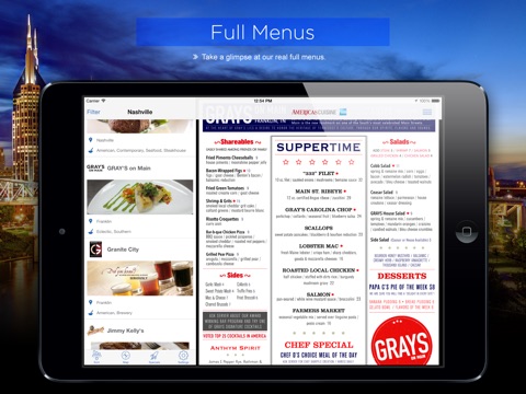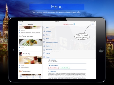 Every restaurant listing includes menus, photos, restaurant amenities, reservation capabilities and GPS directions to help mobile diners find the best meal in the city. Using advanced search options, pick your restaurant by name, location, cuisine type or meals served with the search option. The Nashville Dining App is supported by AmericasCuisine.com, a Nationwide Dining Guide that diners and travelers have learned to trust over the past 20 years.