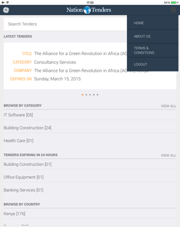 Nation Tenders makes it possible to read, search, classify and share Tenders the way you want, all on your mobile phone. The Tenders are reproduced from the print editions of Nation Media Group publications and faithfully represent the agreed-upon text between the Advertiser and Nation Media Group. For easy confirmation, newspaper where the tender was published, the date and the page number are provided. Each Tender is classified by Tender Number, Type of Tender, Industry, Category of Service, Organization Tendering, Deadline and Country.