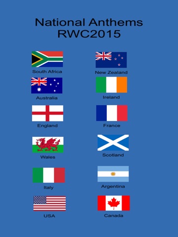 National Anthem Lyrics for the Rugby World Cup 2015. Select one of the world flags to select the Anthem lyrics you would like to see. Canadian National Anthem, French National Anthem, England National Anthem, New Zealand National Anthem, Scotland National Anthem, Wales National Anthem, United States National Anthem, South African National Anthem, Italian National Anthem, Australian National Anthem, Argentina National Anthem, Irish National Anthem.