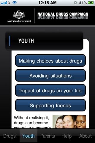 The Australian Government’s National Drugs Campaign app allows instant access to information on illicit drugs and services for youth and parents.