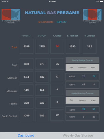 The Natural Gas PreGame app, provides Real-time EIA Weekly Natural Gas Storage Report, Analysts Expected Forecasts and Consensus Storage Forecast.